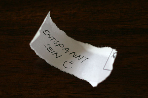 1. "Entspannt bleiben". Wie schön. Ja, das ist einer guter Wunsch für das neue Jahr. Wäre keine schlechte Idee, würde ich mir auch so einen Zettel ins Portmonaie legen ..