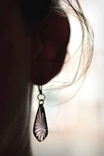 In die Ohrhänger hatte ich mich sofort verliebt: geschliffene, fliederfarbene Vintage-Glastropfen mit einem Goldrändchen.