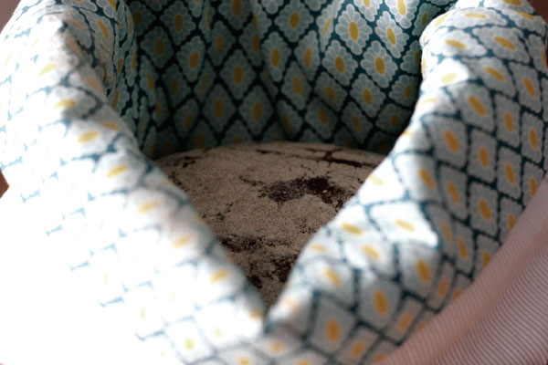 Außen zwei alte, gerippte Tischsets. Die Flecken schön nach innen geschummelt ;.)