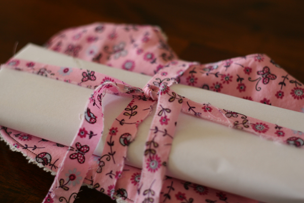 Wie schon beim letzten Lätzchen habe ich auch hier ein paar bunte Plastiklöffelchen dazu gelegt. Schnell in Papier gewickelt. Ein Stoffstreifen als Band drumherum. Fertig!