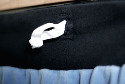 Wie passend. Hier lag noch hellblauer Nicki und dunkelblaue Bündchenware herum. Und Leinenband für den sportiven Streifen an der Seite war auch noch da. Gut, dass ich in einer älteren Ottobre (1/2008) einen Schnitt gefunden habe, der der alten »Kuschelhose« genau entsprach: mit schön weitem Bein, nur ohne Seitenstreifen, aber das dürfte ja eigentlich kein Problem sein :.)