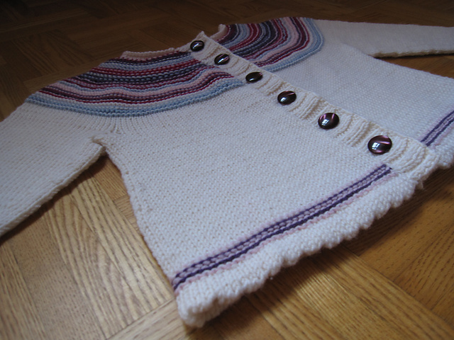 Die zerronnene Ringelmütze hat mich wieder an das süße kleine Strickjäckchen für meine Nichte erinnert. Denn auch dieses gute Teil ist auf mysteriöse Weise verschwunden. Ich bin immer noch ganz traurig :.(