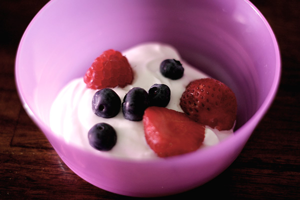 Alles mit einer Gabel zusammenrühren und mit Erdbeeren, Himbeeren und Heidelbeeren garnieren. Yummy!