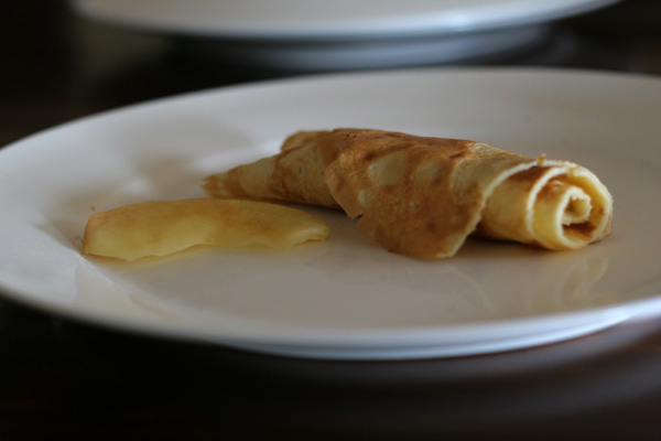 Einfach Crêpes backen. Halbieren. Mit wenigen Apfelschnitzen belegen, die in der Pfanne gebraten wurden. Einrollen Fertig!