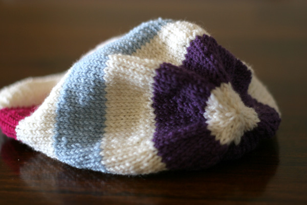 Und wer die Mütze nachstricken will, der möge sich bitte den »Lollipop Hat« von Anadiomena anschauen. Ich habe lediglich das Rollbündchen durch ein Rippenbündchen ersetzt.