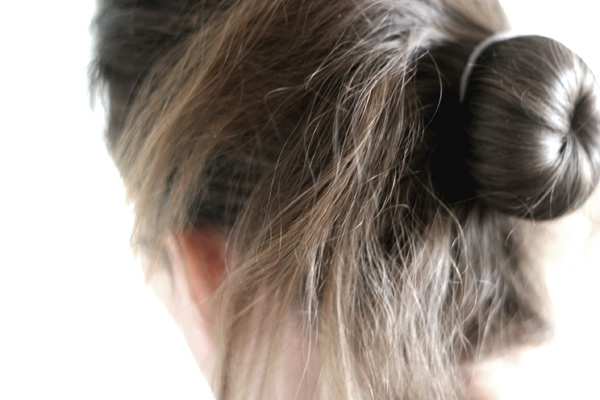 Wenn ihr mindestens schulterlanges Haar habt, braucht ihr lediglich einen Duttring (ein Duttkissen in Donutform), zwei Haargummis und ein paar Haarnadeln oder Haarklemmen.